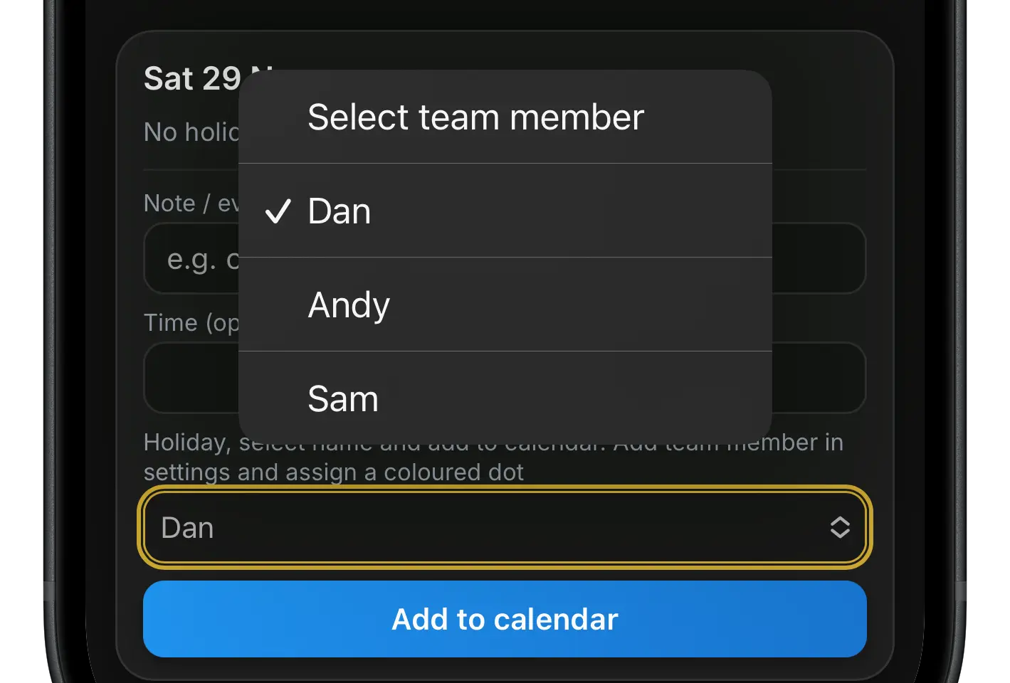 Select a date, choose a team member from the dropdown, and tap Add to Calendar.