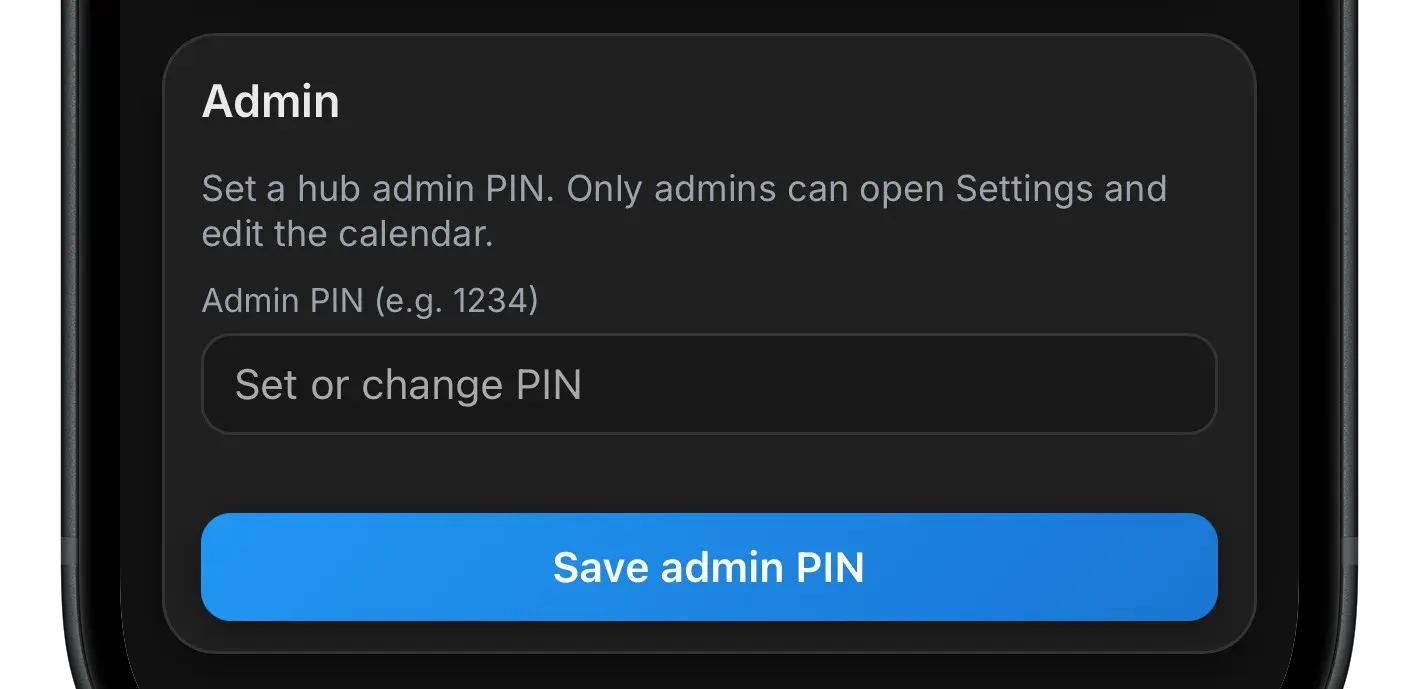 When a PIN is set, it will be required to open Settings or make changes to the Calendar. Leave this blank if you don’t need admin protection.